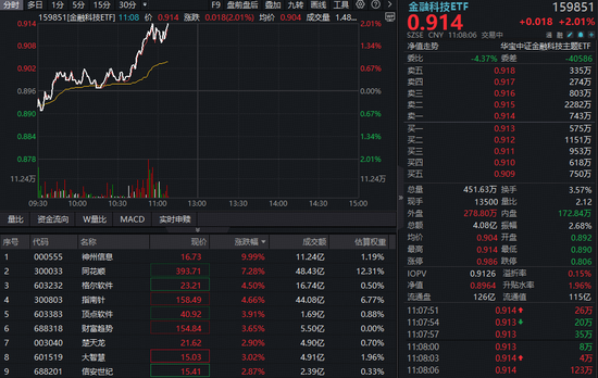 29日早盘金橘策略,互联网券商异动拉升,金融科技放量冲高!截至发稿,同花顺大涨超7%,指南针、财富趋势、银之杰、大智慧、东方财富等多股涨超2%。金融软件方面,神州信息涨停,格尔软件、顶点软件等涨超2%。热门ETF方面,百亿金融科技ETF(159851)场内拉升逾2%,日线冲击五连阳,实时成交额超4亿元,环比放量明显。
